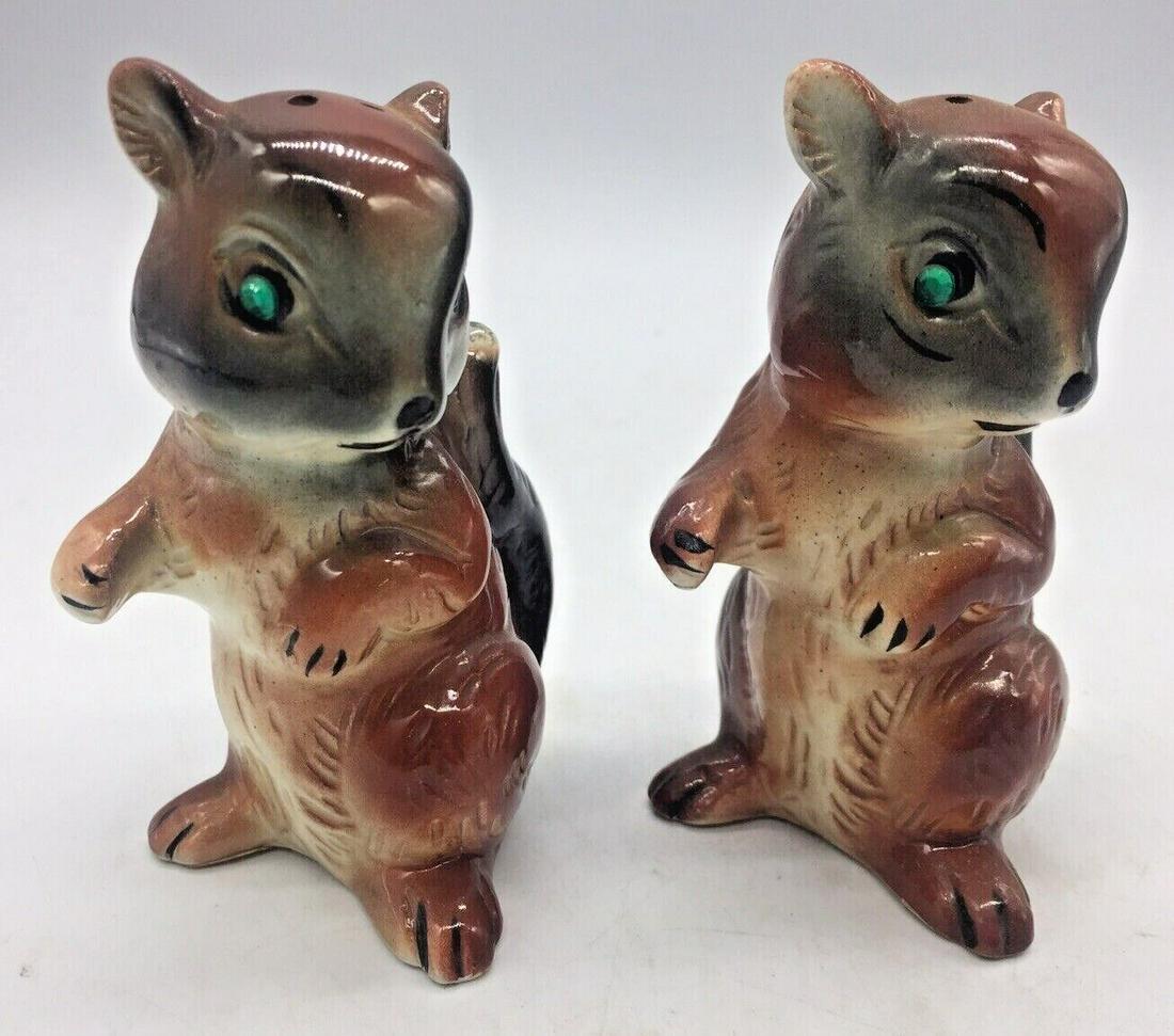 Vintage Relco Japan Squirrel Salt And Pepper Shakers Green Sparkly Eyes